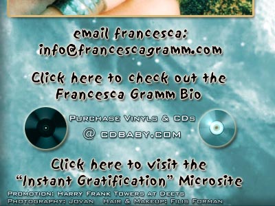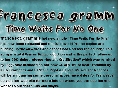 send an e-mail to francesca Francesca Gramm Bio Francesca Gramm's First Single - Instant Gratification purchase the vinyl Click here to listen to a clip of Time Waits For No One Click here to view lyrics to Time Waits For No One